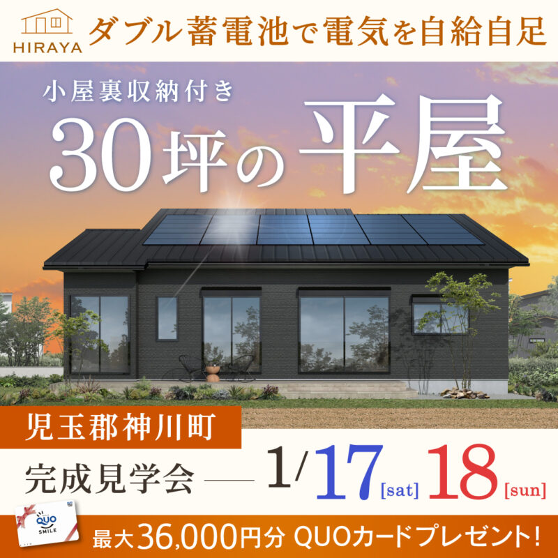 神川町の新築完成見学会「ダブル蓄電池で電気を自給自足。小屋裏のある30坪の平屋」ご来場ありがとうございました