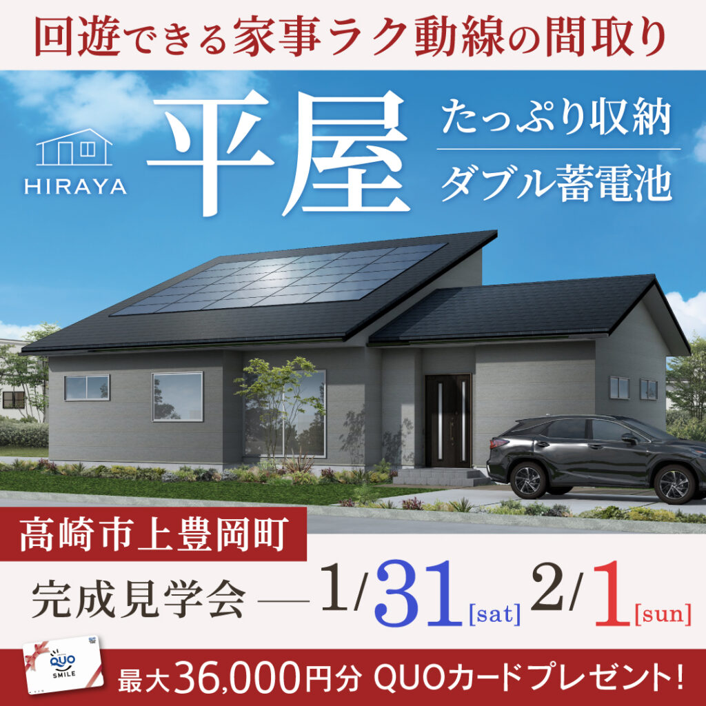 「冬暖かく高断熱&家事ラク間取りの28坪平屋」前橋市の新築完成見学会