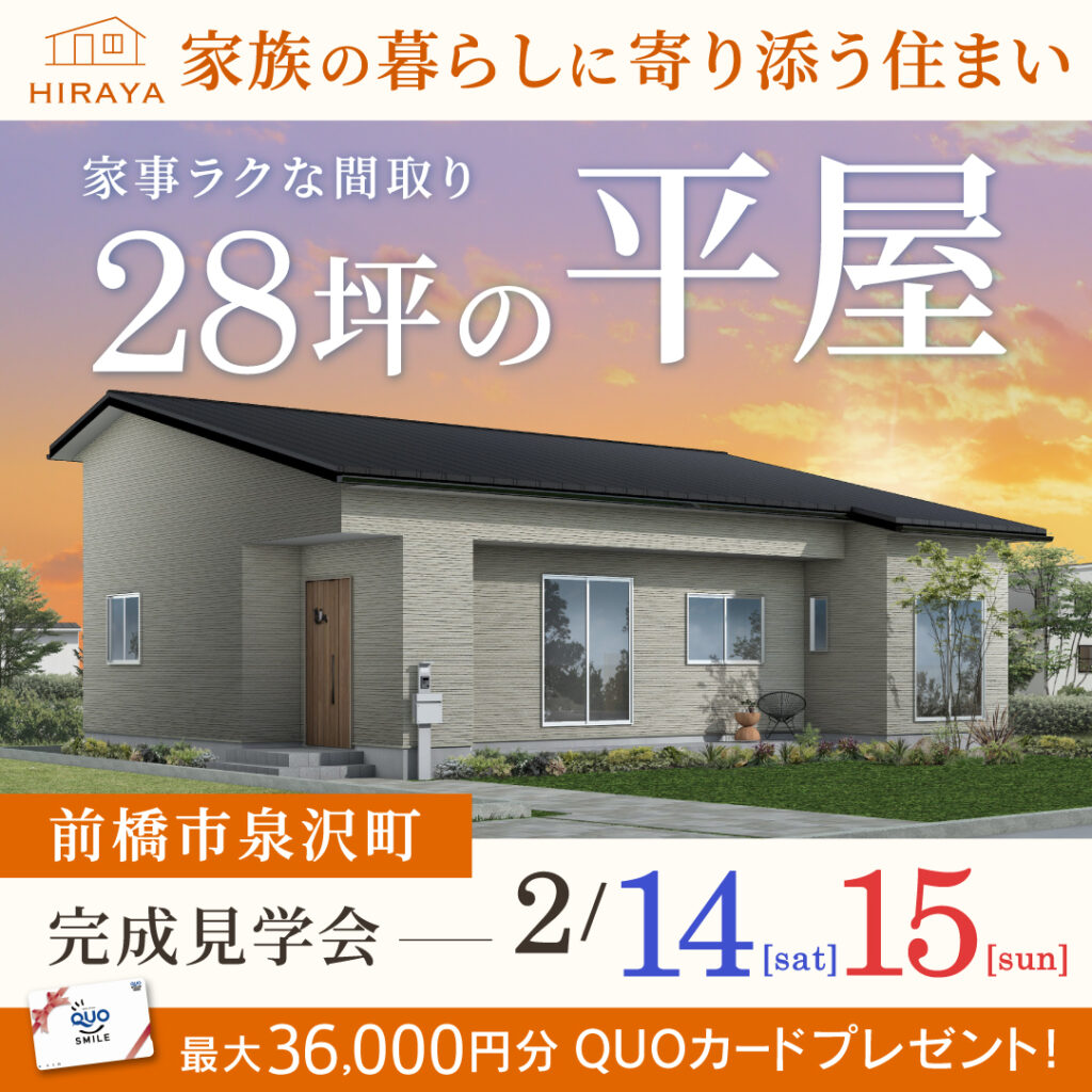 「冬暖かく高断熱&家事ラク間取りの28坪平屋」前橋市の新築完成見学会