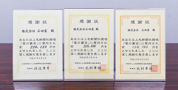 上毛新聞社 愛の基金 2018.06.26 社会貢献活動 毎年恒例の、のみの市やお客様感謝祭のチャリティーイベントの収益金を上毛新聞社「愛の募金」に寄託し、立派な感謝状を頂きました。 (左から上毛新聞会長の北村幸雄氏、石田社長、石田屋総務部部長宮下)