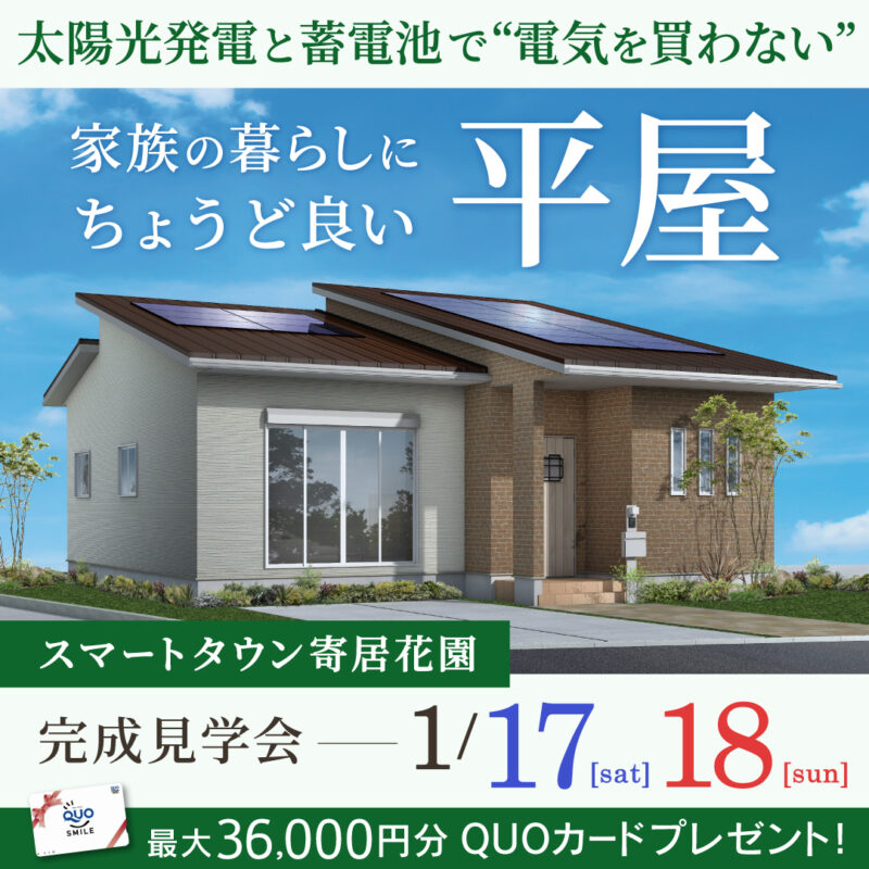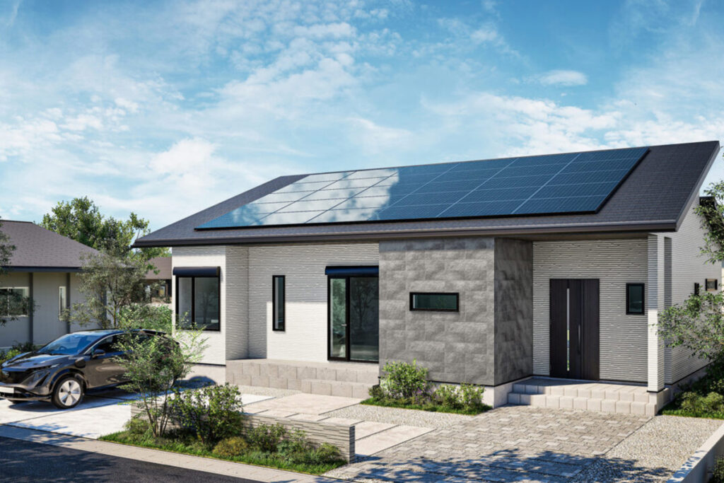 断熱等級7の最高性能とIoT技術で健康的で快適な暮らしをサポートする超省エネ住宅「GrandiaSmartGX+」の平屋モデルハウスです。電気を買わない生活を目指し、電力自給率100%以上を実現します。