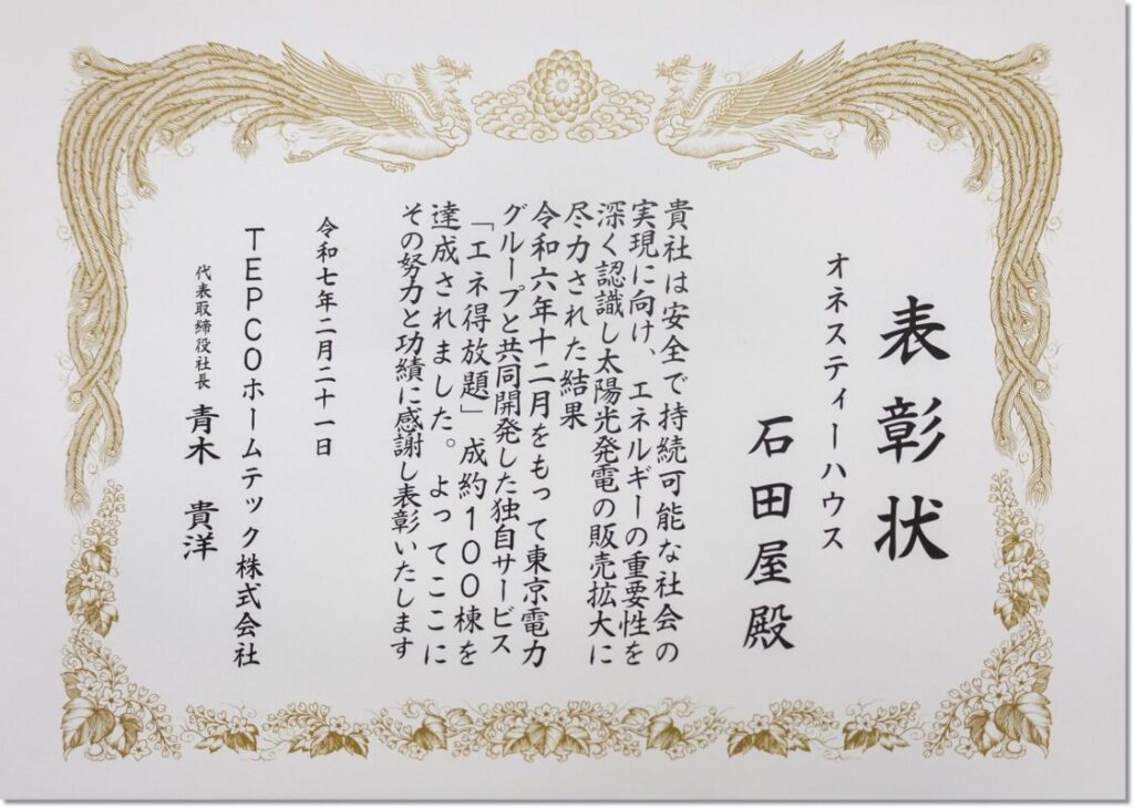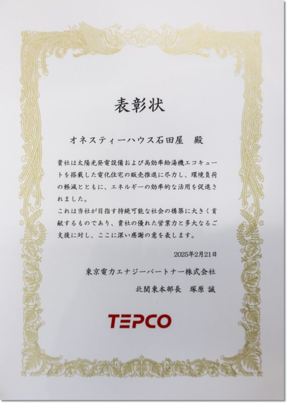 また、当社が推進しているエコキュート搭載住宅の販売活動についても、環境負荷の低減やエネルギーの有効活用の面で高く評価され、東京電力エナジーパートナー株式会社さまより表彰を受けました。
