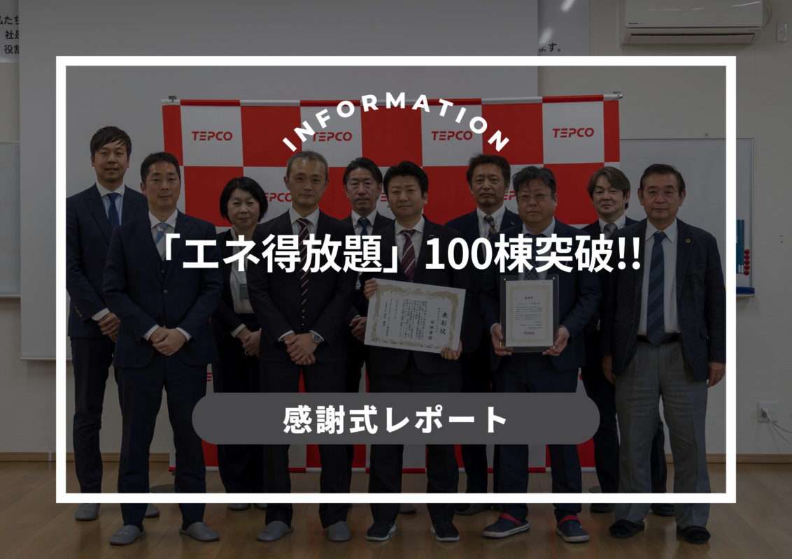 今回の感謝式は、当社と東京電力グループが共同開発した独自サービス「エネ得放題」の成約棟数が100棟を達成したこと、そしてエコキュートを搭載した電化住宅の普及促進に貢献したことを受けてのものです。