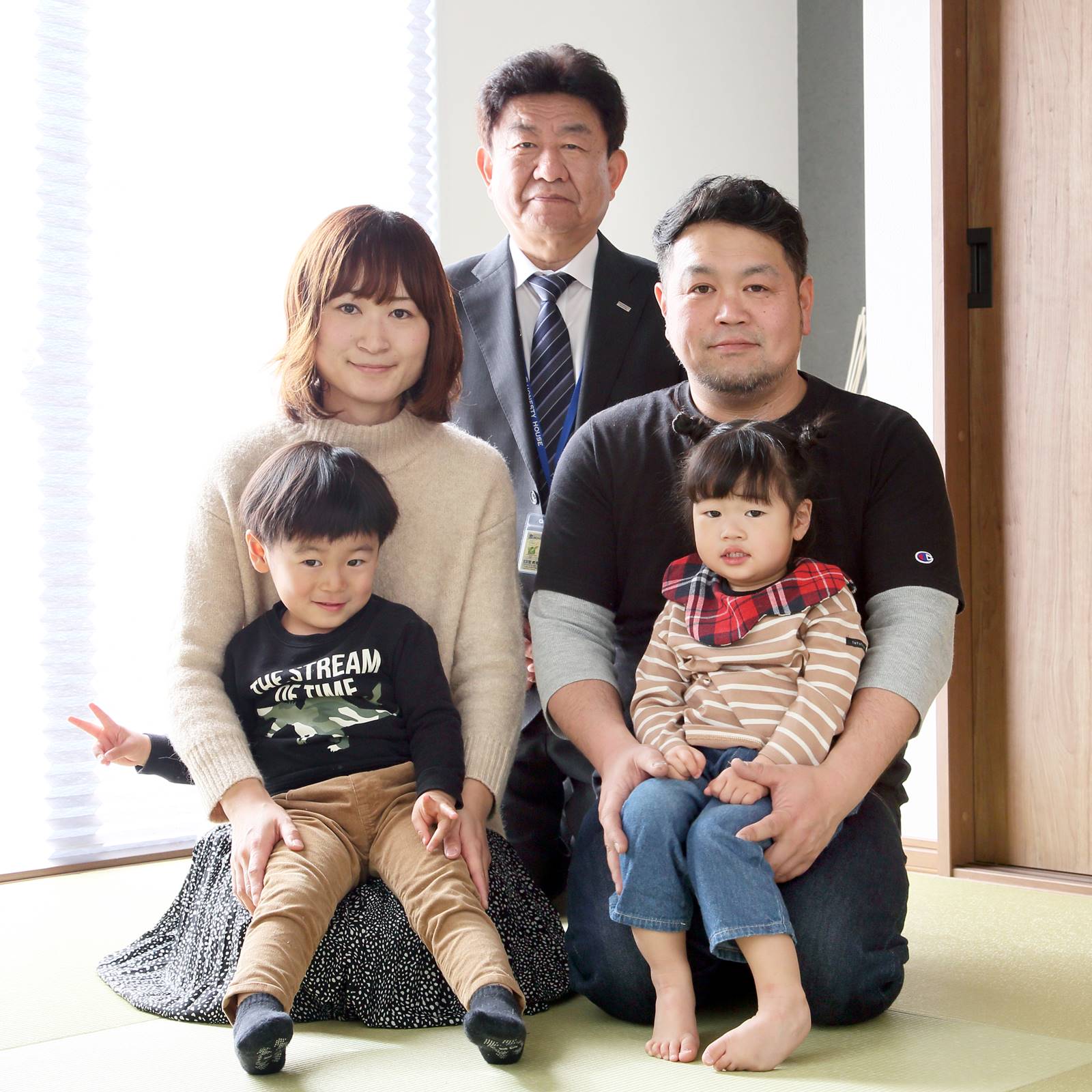 「とても楽しい家づくりでした!」と笑顔のOさんご家族と、担当営業の新井さん(後ろ)