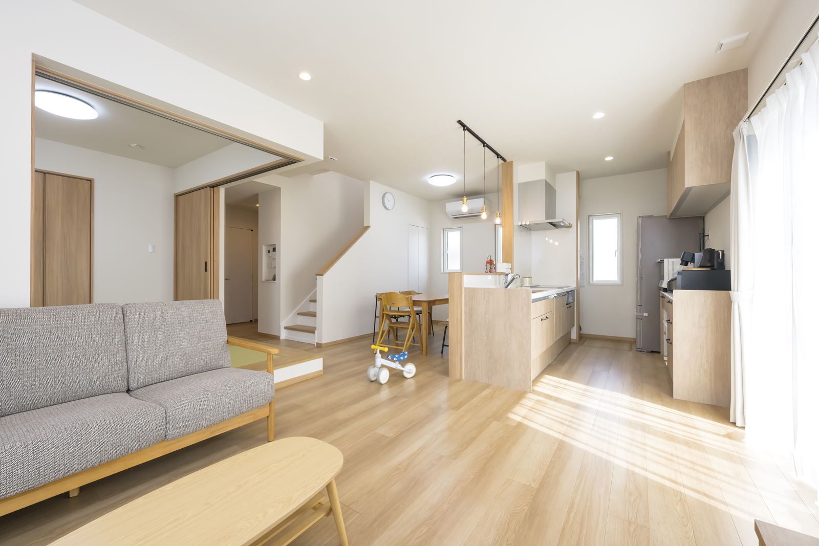 LDKと繋がる小上がりの和室は子どもの遊び場やゴロゴロスペースに。引き戸を閉めれば客間にも活用できる。
