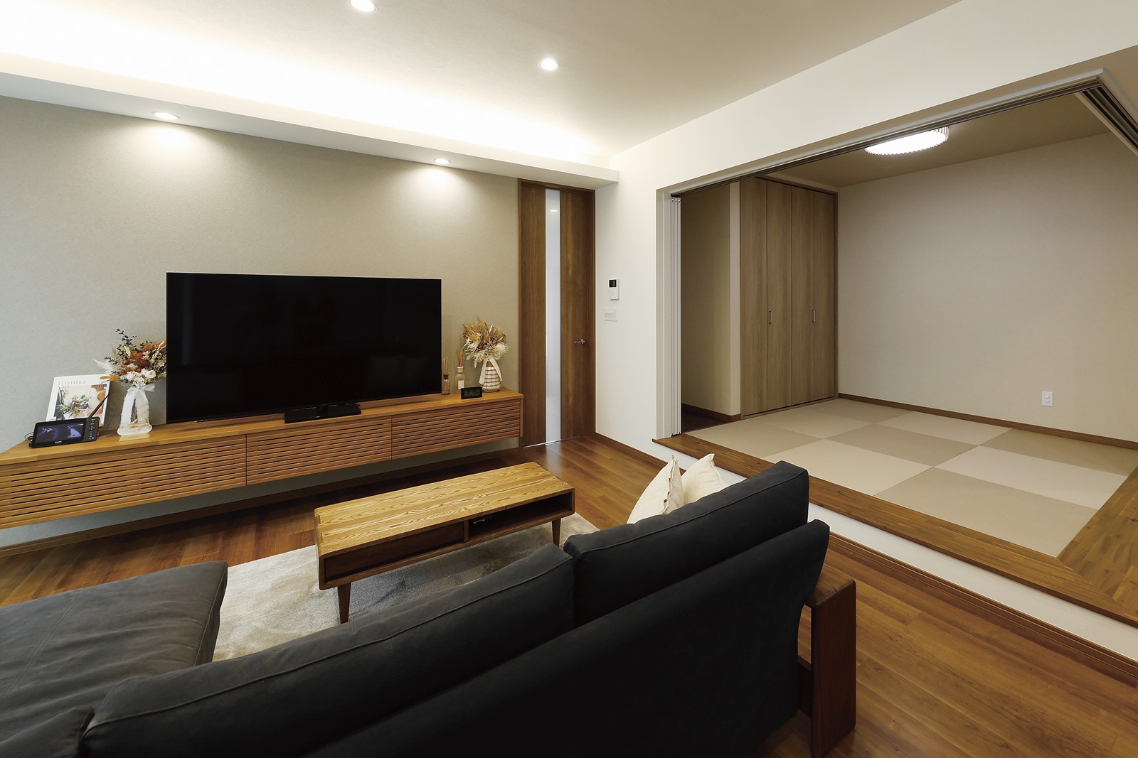 小上がりの和室まで一体化する「柱の無い広々空間」は石田屋さん ならでは