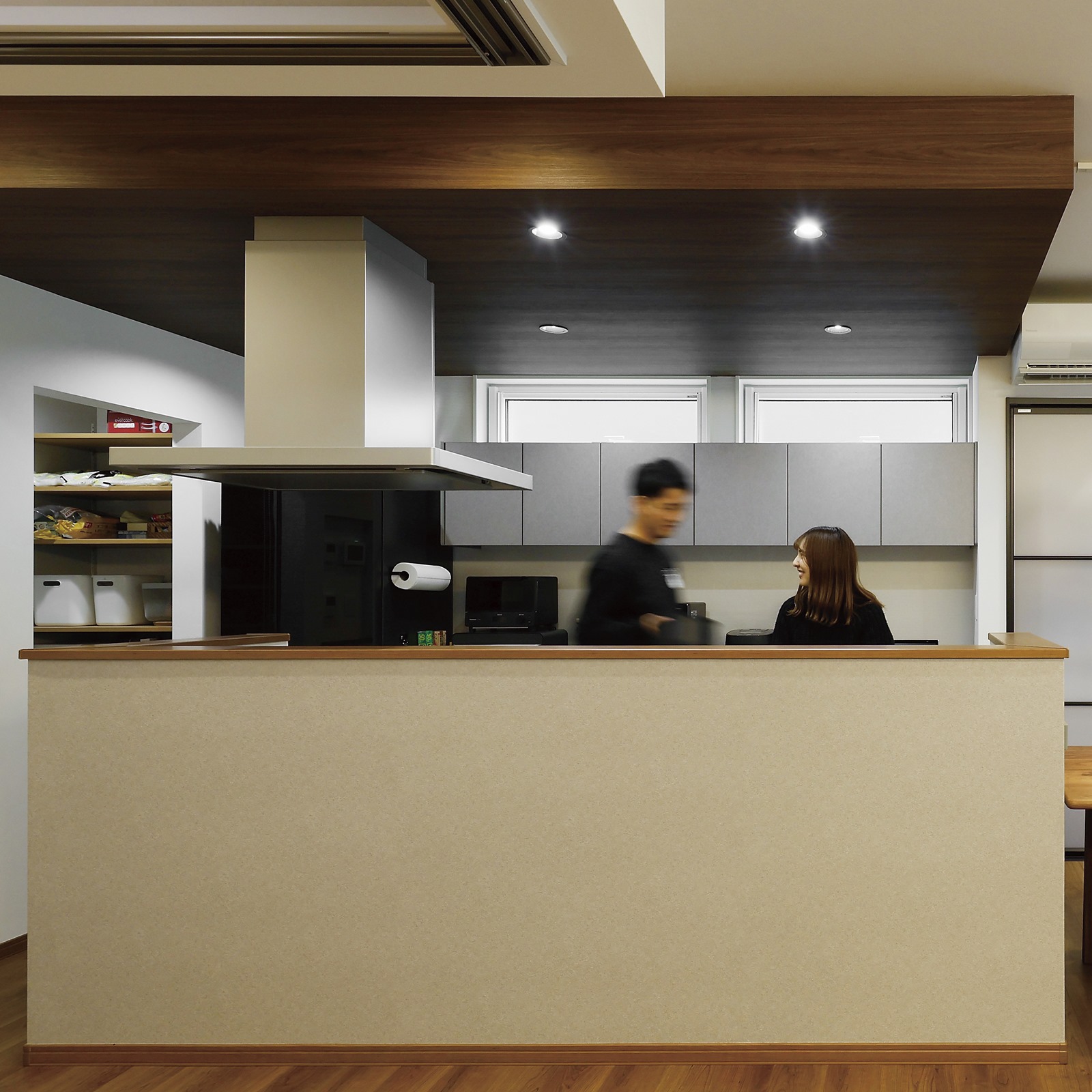 グレーのキッチンに合わせて、濃い木目・ 乳白色・黒で好みの内装に。
