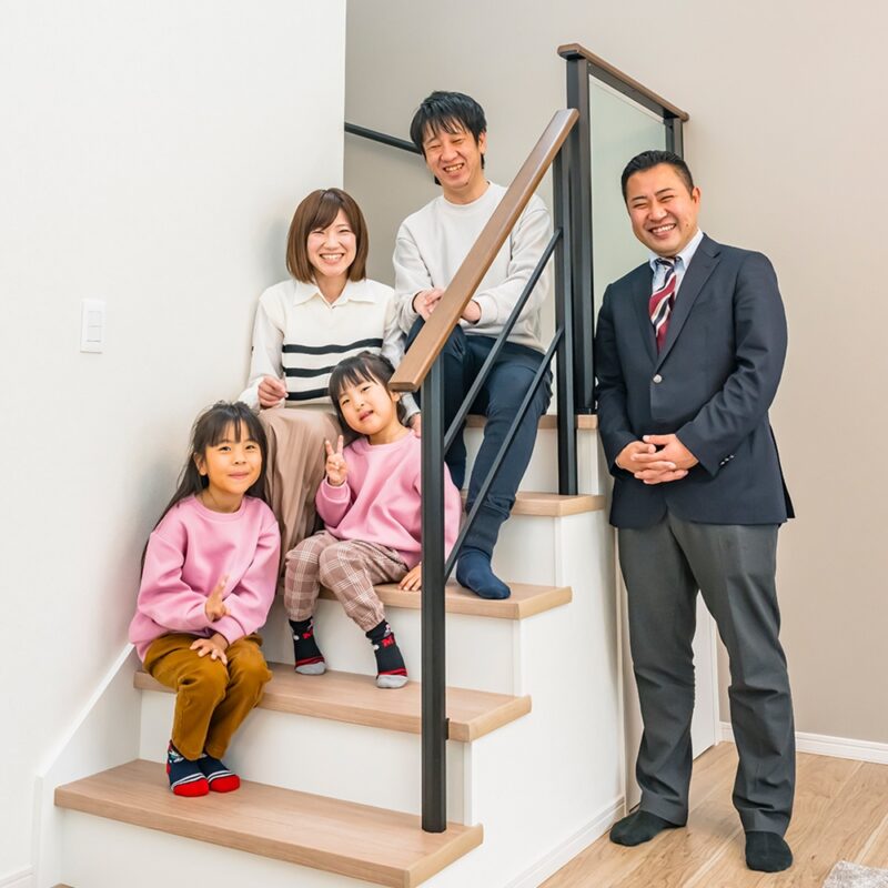 間取りも内装も大満足! 家にいるだけでうれしい。ご家族と担当者(右)