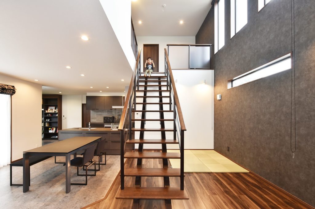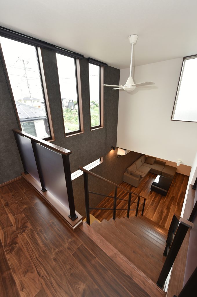 LDKの床は重厚感と高級感の漂う質感で、北側部分には大きな吹き抜けがあり、ダークカラーの空間にほどよい光が降り注ぐ。