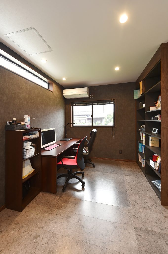 一方、キッチンから続く南側の空間に間仕切りのない書斎を配置したのも特徴的。キッチンで家事に向かう奥さまと同じ空気を感じられる造りだ。