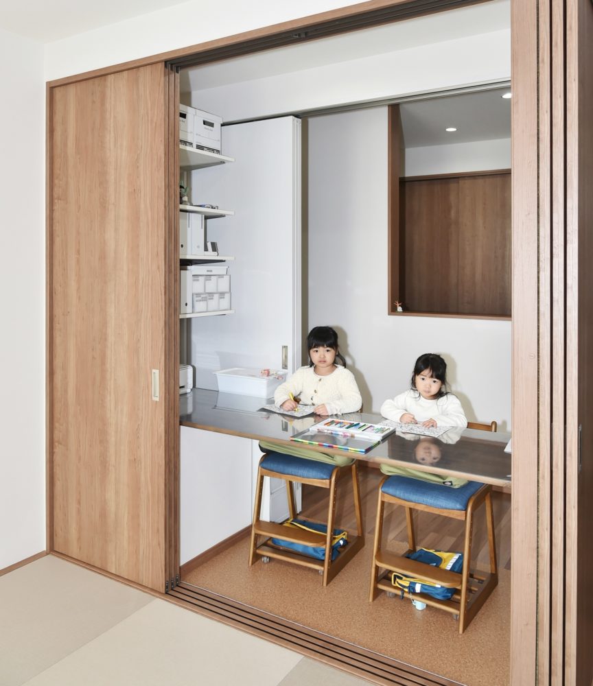 当初、和室に押し入れを設ける予定だったが、両面から開閉できるようにすることで、収納だけでなくお子さんたちの学習スペースにした。