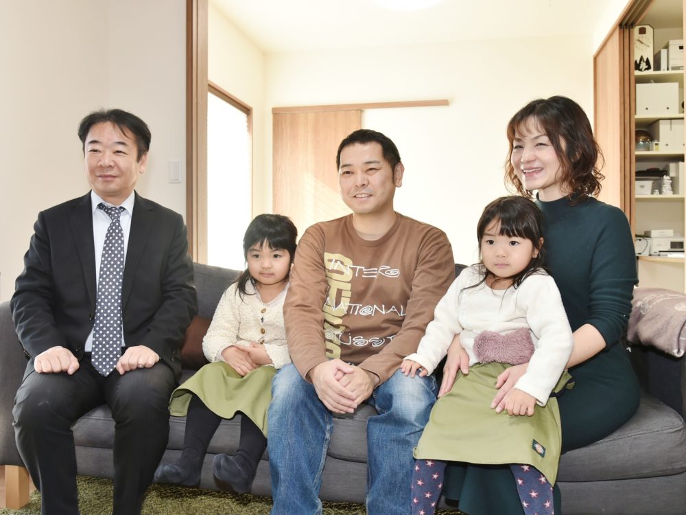 「石田屋さんのおかげで、本当に暮らしやすい住まいが実現しました」と 小林さんご家族。左は矢嶋英明住宅営業部長