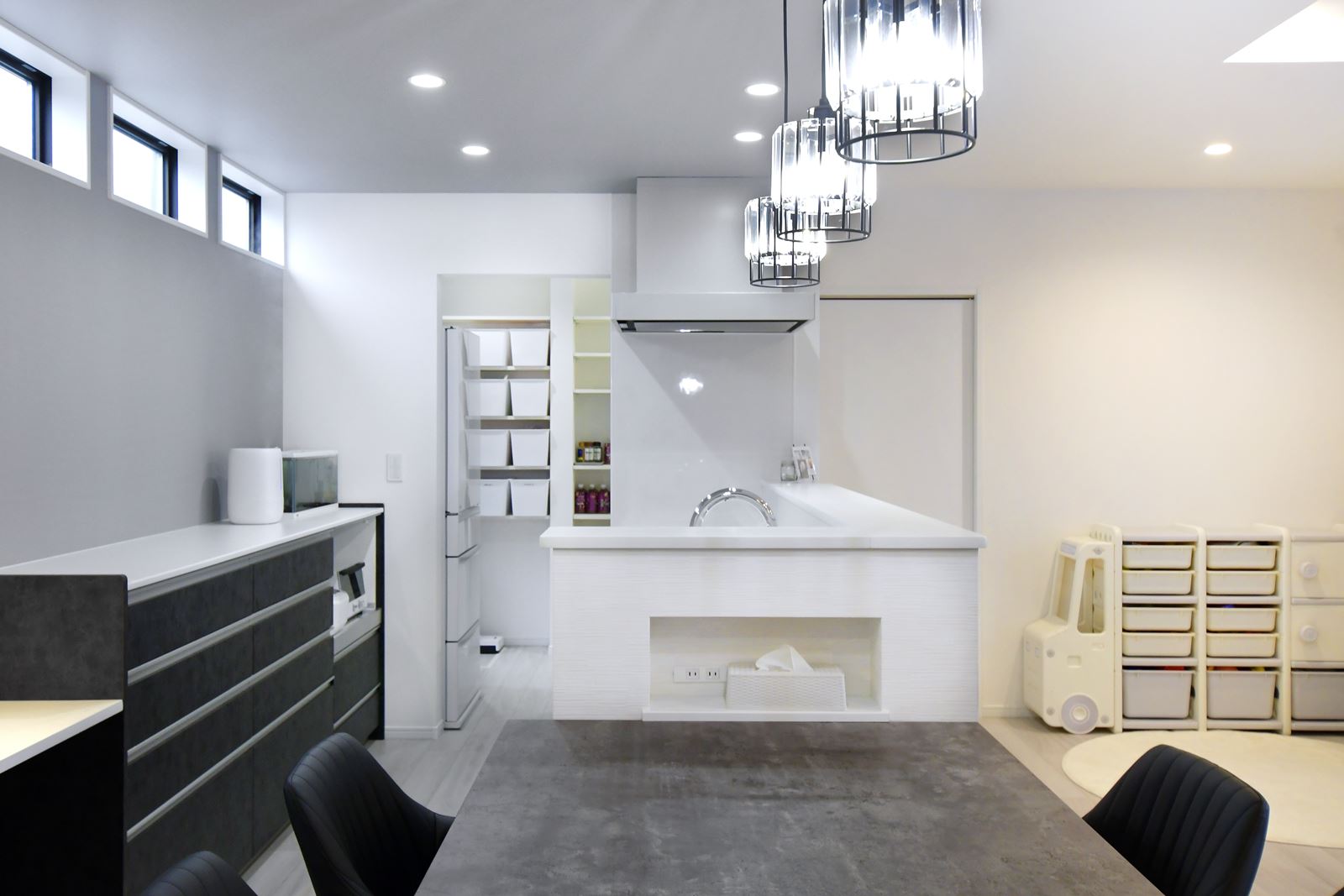パントリーを広く取り、冷蔵庫や電子レンジを置くことで、キッチンの周りをすっきりさせたのも特徴だ。