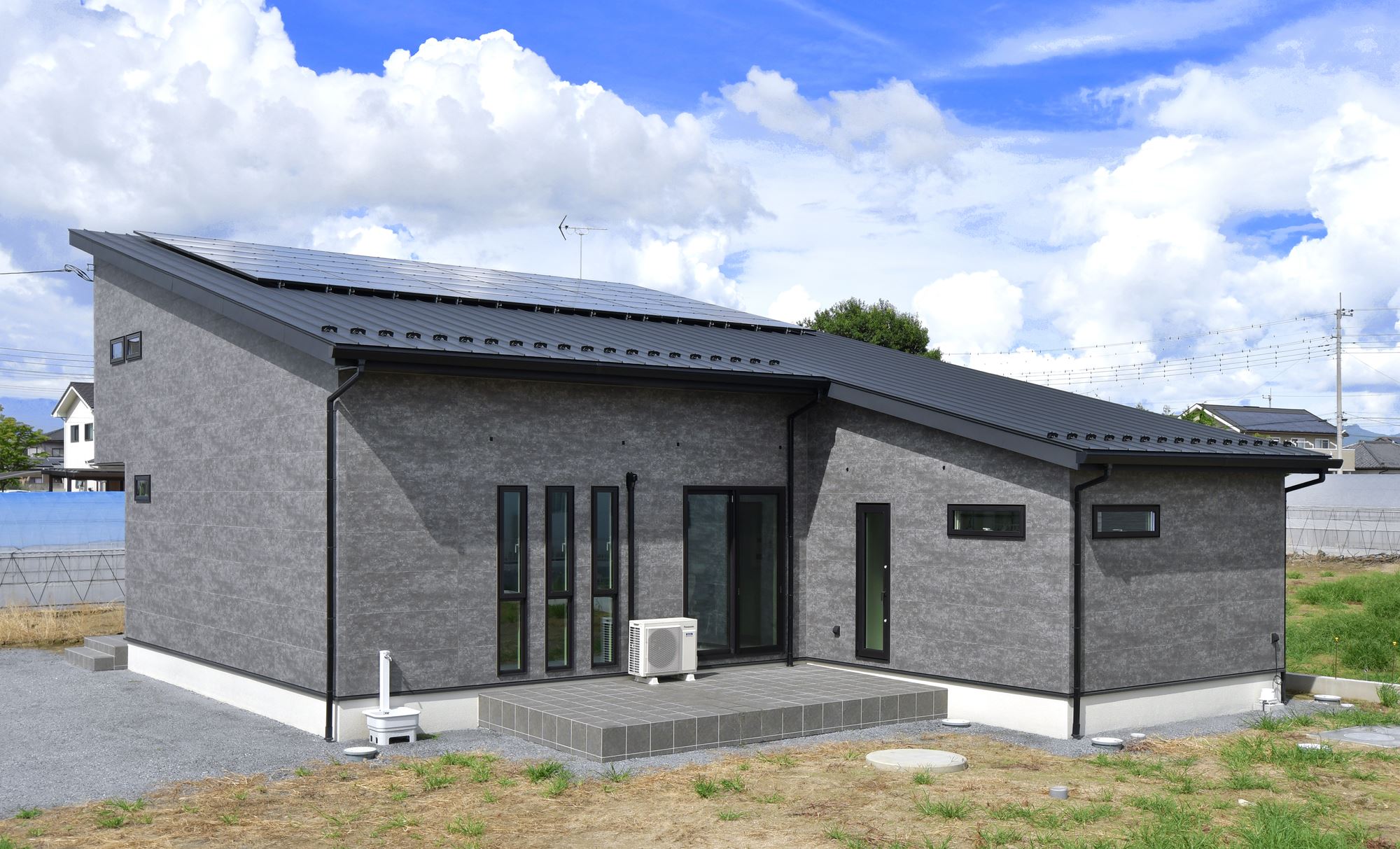 片流れの大屋根に太陽光パネルを11.55キロワット搭載した住まい。