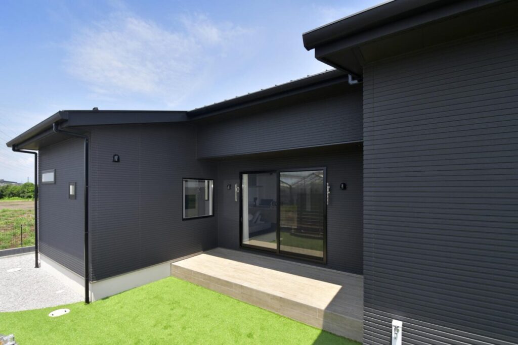 平屋とは思えないほどの高さが感じられ、外壁を黒一色で統一した重厚感のあるたたずまい。