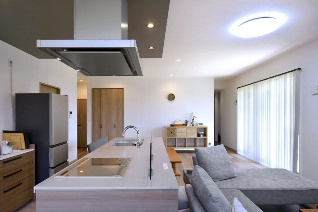 家族のコミュニケーションを重視した間取りを希望したご夫妻。アイランドキッチンを中心に導線を巡らせ、あえて廊下を設けず、リビング空間からそれぞれの部屋へスムーズに直接つながる。