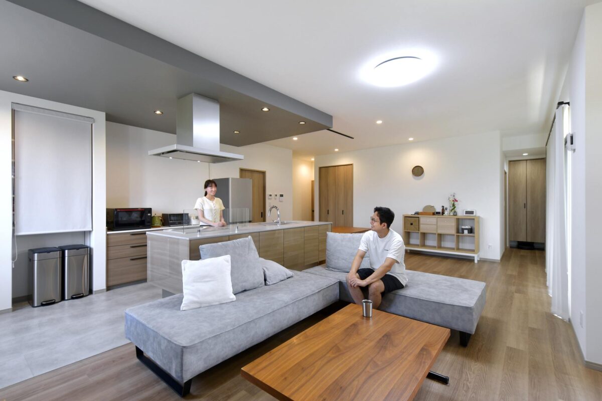 家族のコミュニケーションを重視した間取りを希望したご夫妻。アイランドキッチンを中心に導線を巡らせ、あえて廊下を設けず、リビング空間からそれぞれの部屋へスムーズに直接つながる。