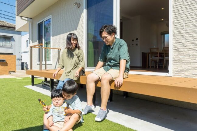 軒下にはゆったりしたタイルデッキ。主寝室プラス3部屋を実現した平屋の住まい