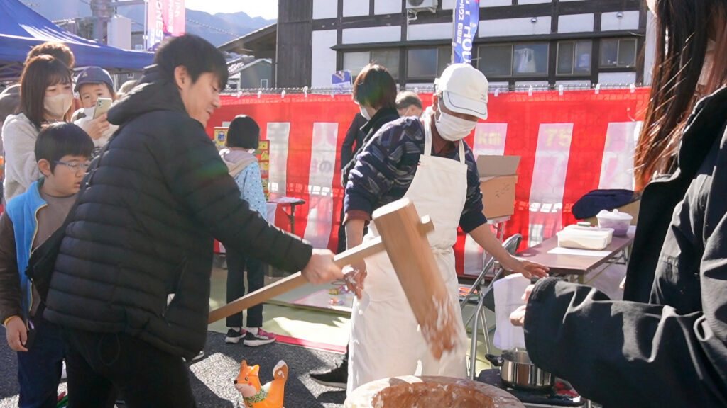 朝10時と午後2時の2回に分けて、伝統的な臼と杵を使った餅つきが行われ、この餅つき体験にはお客様も参加。