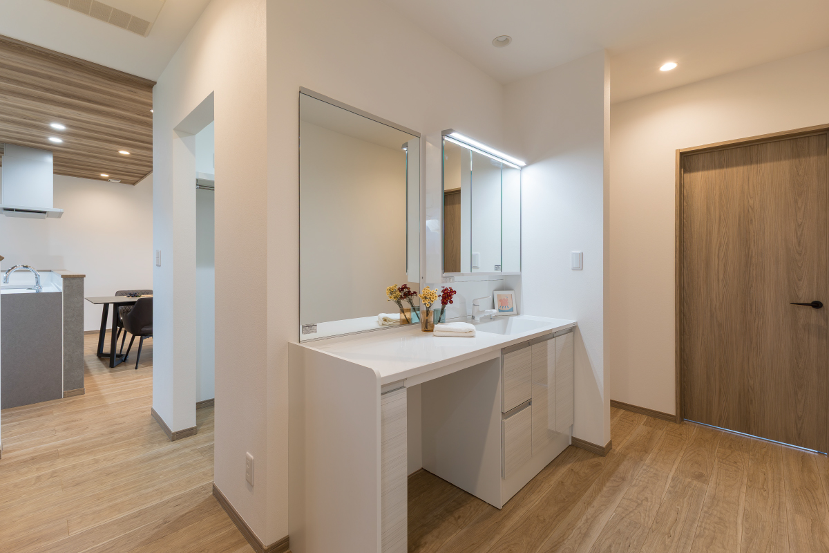 朝の忙しい時間もスムーズに。2人並んでもゆったり使えるワイドな洗面台。外から帰ってすぐに手洗いができるので、清潔で安心