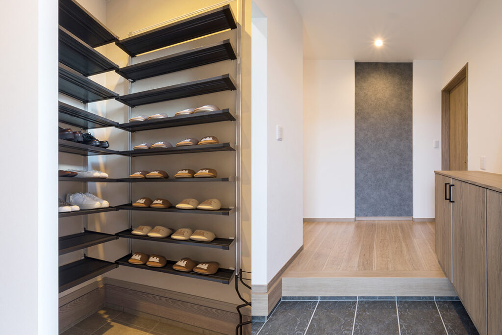 玄関横には、大容量の土間収納を設置。アウトドア用品やベビーカー、季節のアイテムもすっきり収納でき、外出・帰宅時の動線がスムーズ