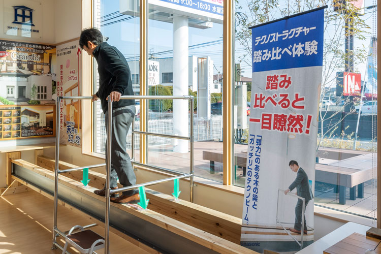 「木の梁」と「テクノストラクチャーの梁」を踏み比べて剛性の差を体感!