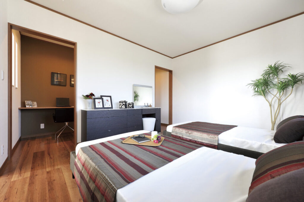 ダークトーンの床とアクセントクロスが演出する落ち着いた雰囲気の寝室。書斎スペースやウォークインクローゼットも便利