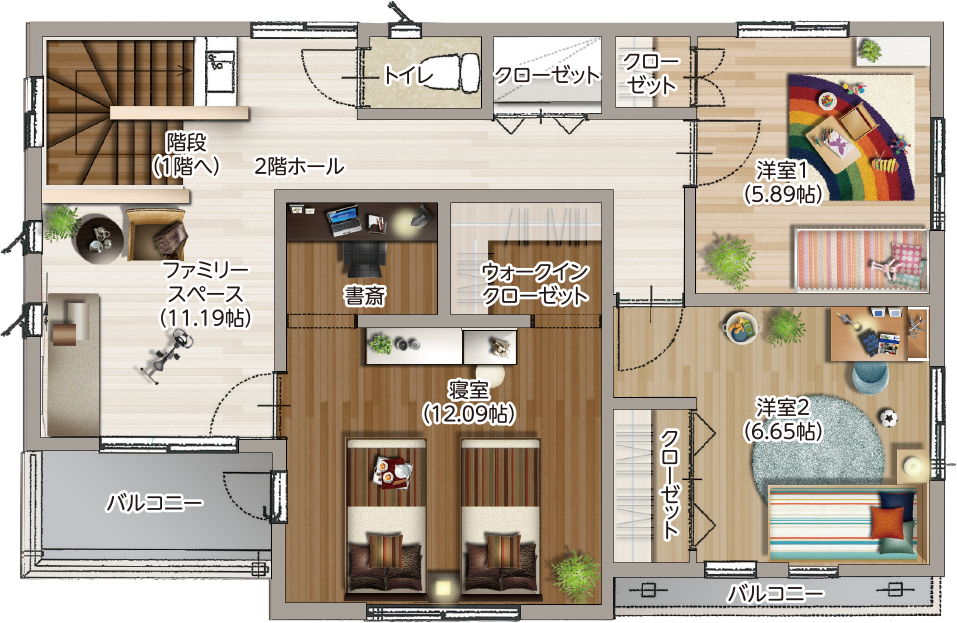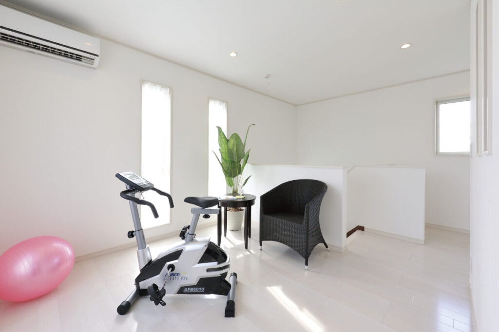 2階ホールは多目的スペース。ホームジムやキッズスペース、セカンドリビングとしても活躍。棚を置けば大容量の収納空間にも