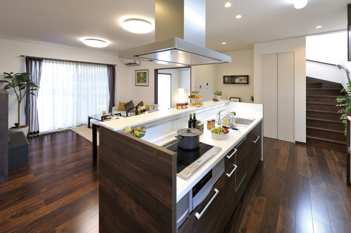 シックなブラウンを基調にした落ち着きあるLDK。深みのある木目調が大空間をより上質に見せ、家族の時間を穏やかに