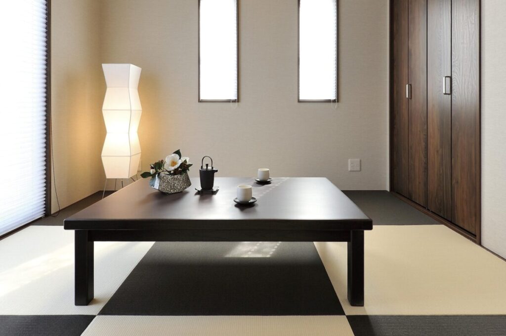 ダークブラウンを基調としたシックな和室。市松模様に組まれた畳が、粋でモダンな和の空間を演出