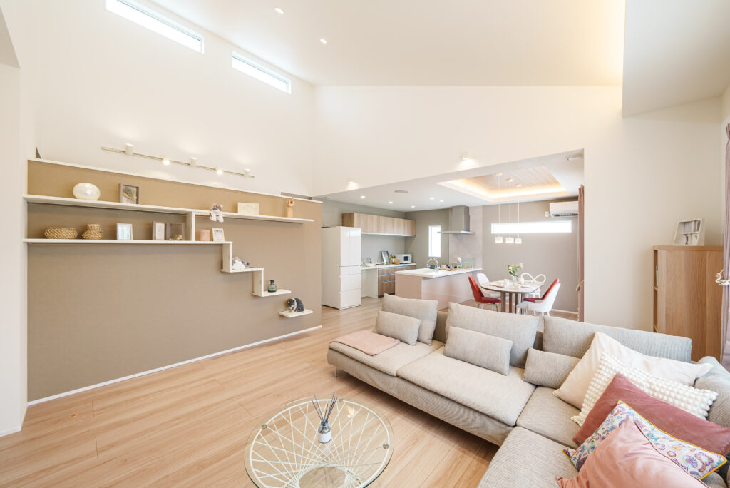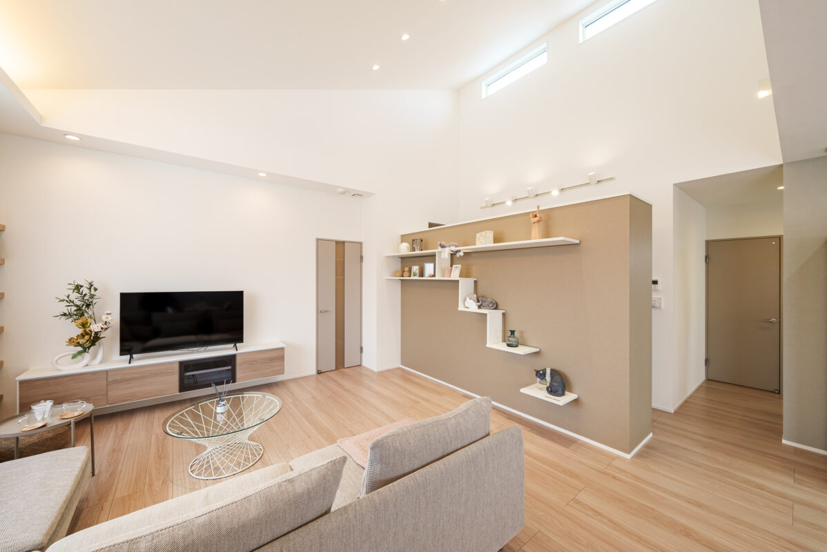 勾配天井と採光窓で、明るさと開放感が広がるリビング。天井高がもたらすゆとりの空間で、家族の時間を心地よく