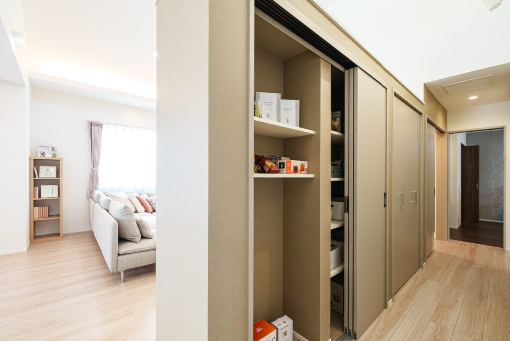 キャットウォークの壁裏には大容量の収納棚。リビングからも玄関からも回り込める便利な回遊動線で、暮らしがスムーズに