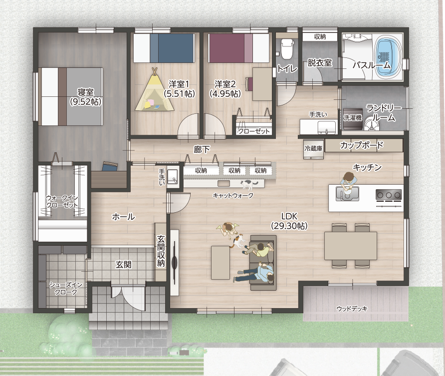 洗濯機から取り出してすぐ干せる通風のよさに加え、泥汚れを落とせるSKシンクも完備。家事効率がぐんとアップ