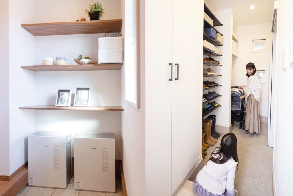 靴を履いたまま出入りができ、靴・雨具など収納可能です。蓄電池の設置スペースにも。