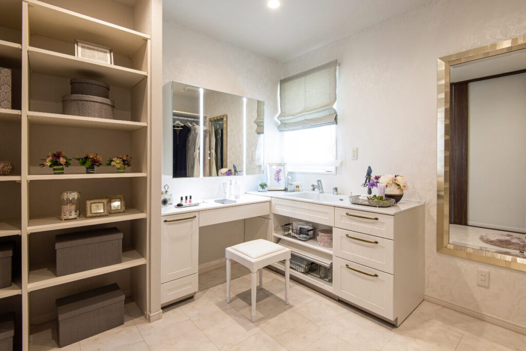 L型に配置した広いカウンタースペースで、メイクもボディケアも存分に