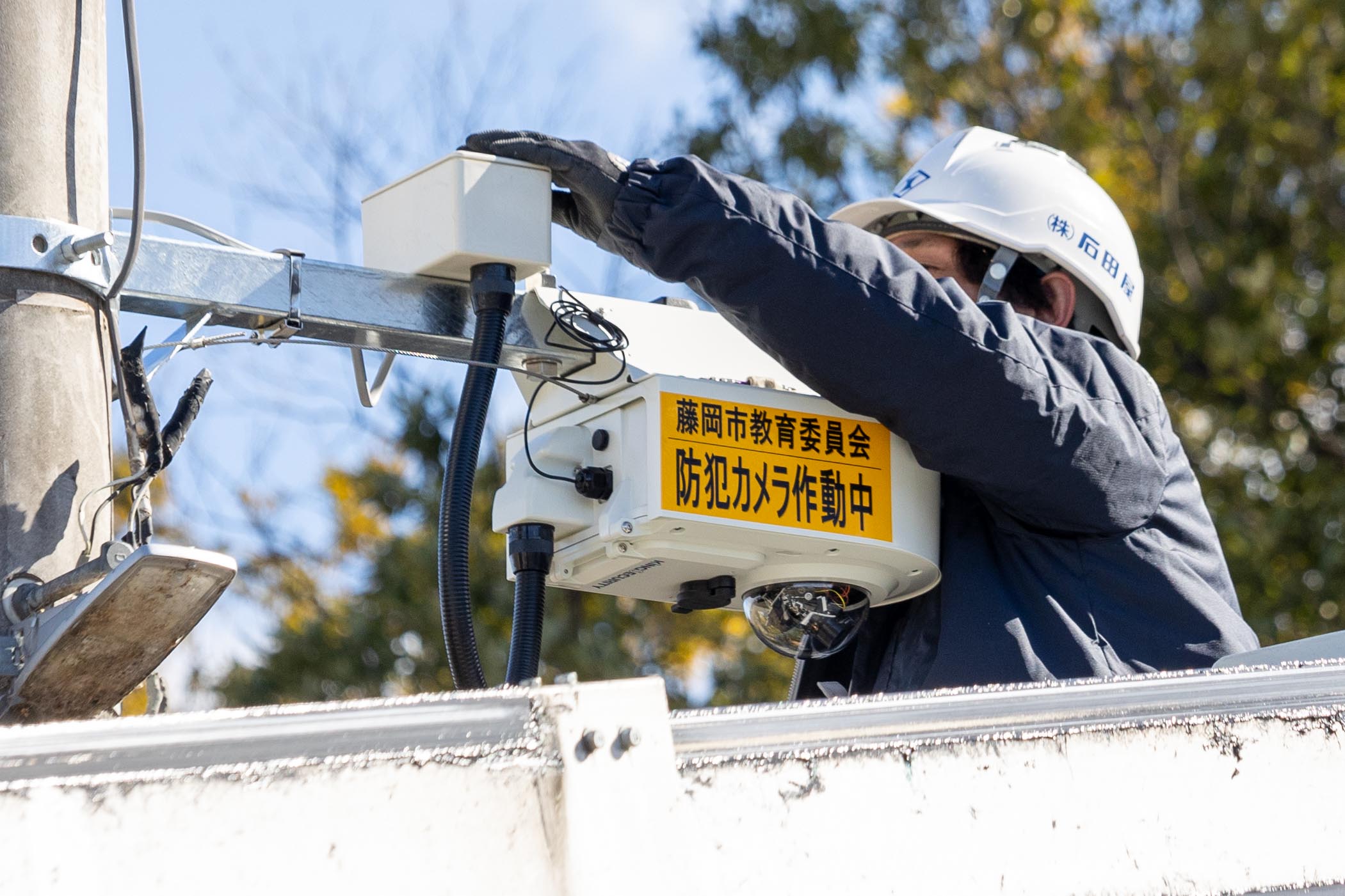 この度、本社のある藤岡市の小学校・中学校に防犯カメラを寄付させていただき、通学路への取り付け工事を行いました。