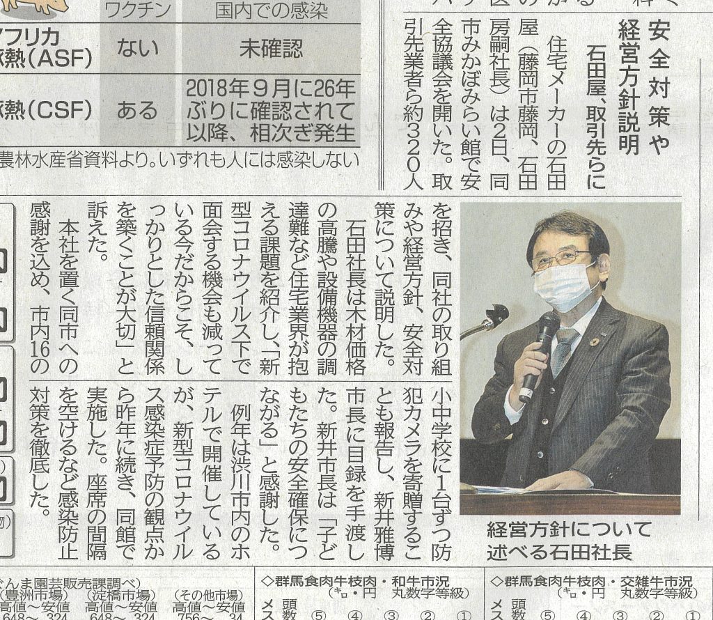 コロナ禍でウッドショックをはじめとした住宅資材の供給量不足や値上がりなど「この混乱期を共に乗り越えるべく協力業者さんとの意識の共有が大事」「堅実経営を続ける石田屋の文化」と石田社長。
