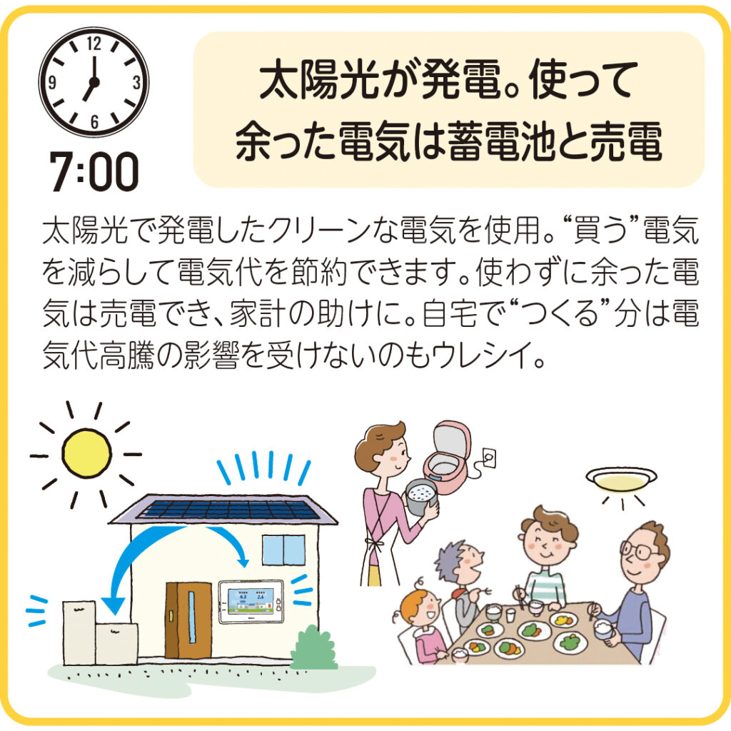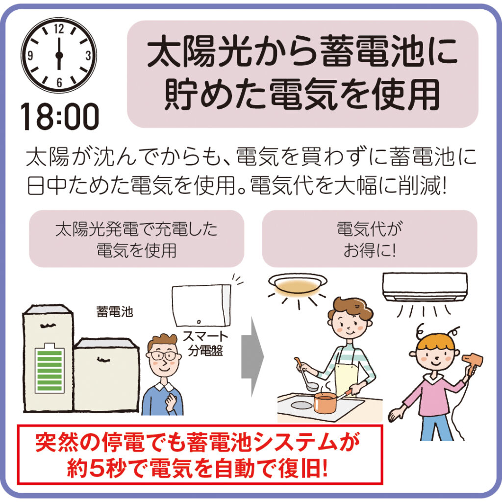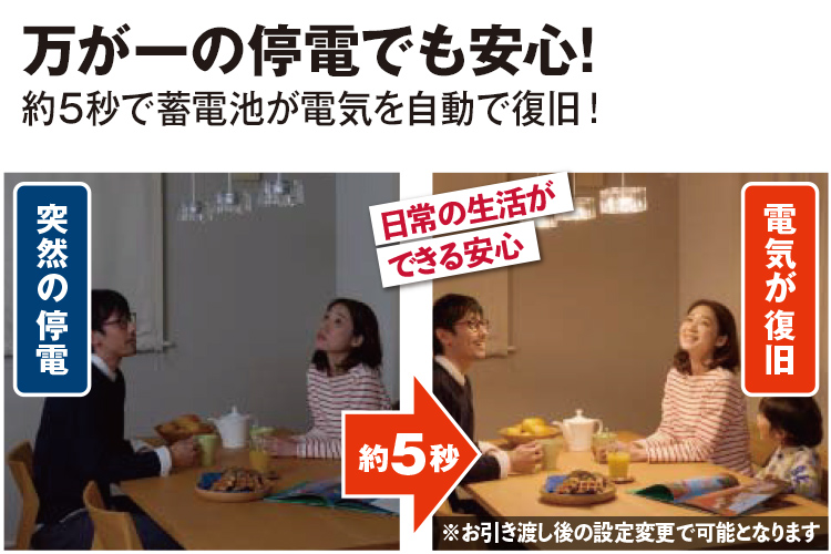 停電でも蓄電池システムが約5秒で電気を自動に復旧。災害などの停電時でも普段の生活ができ、安心です。