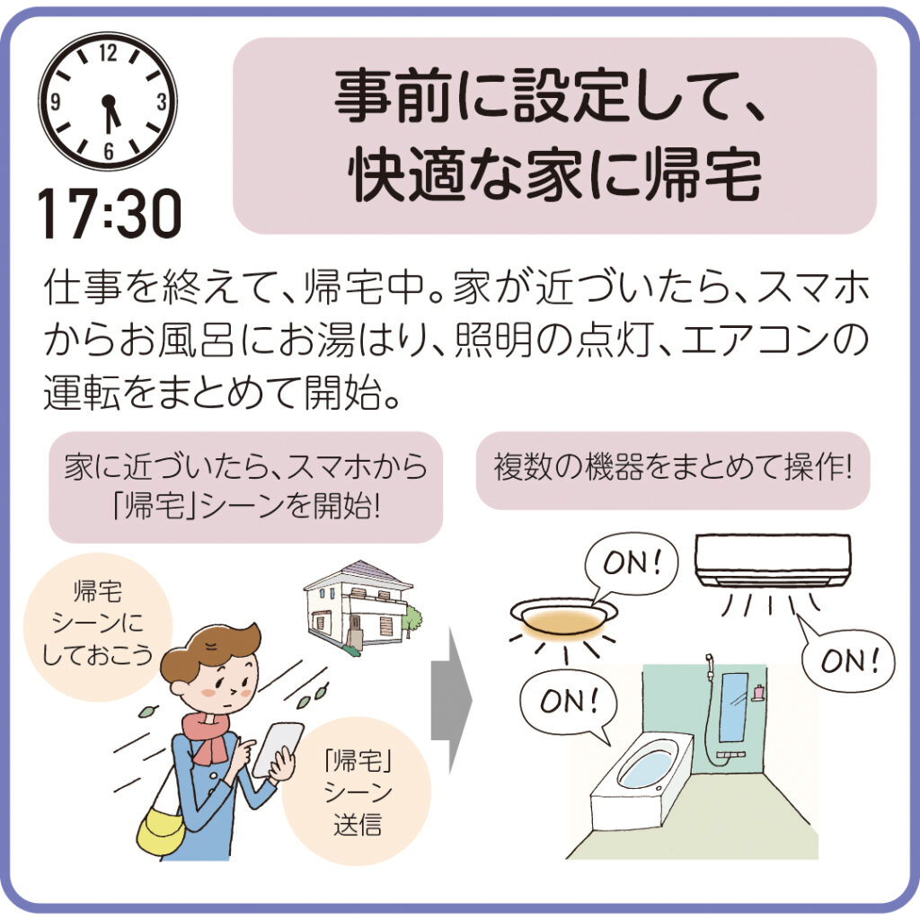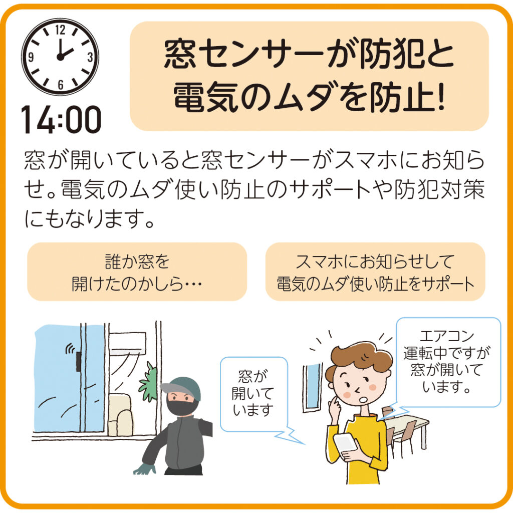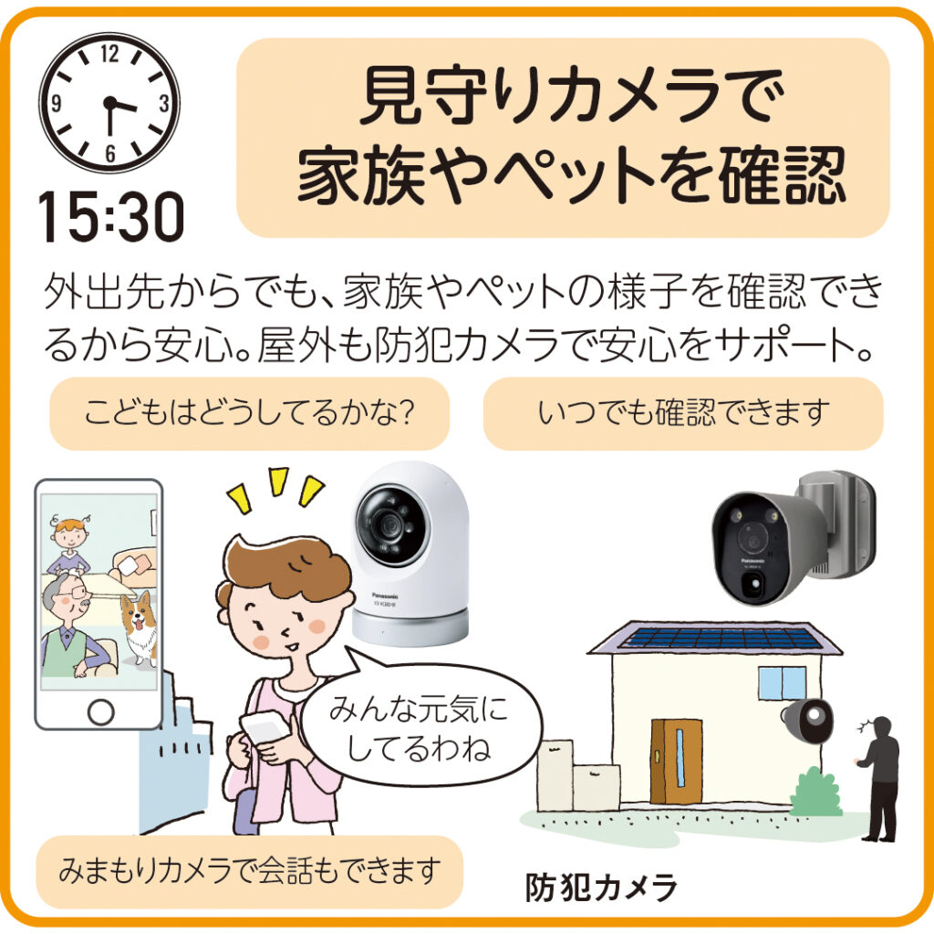 エアコンや明かり、お風呂や電動窓シャッター、防犯カメラ、みまもりカメラ、玄関ドアの施錠まで、住まいの隅々までコントロール。家事や光熱費の効率化に加え、安全で安心な暮らしをサポートします。