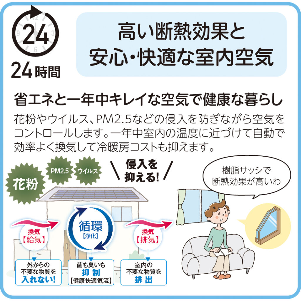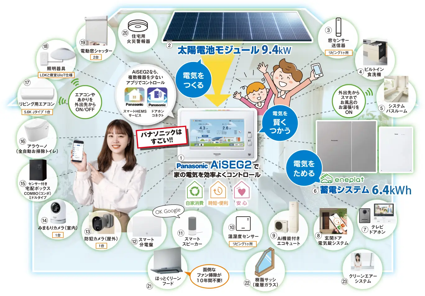スマートネクストは、これら23個の機能を「標準仕様」にし、子育て・共働きなど、様々なライフスタイルを応援するスマートハウスです。電力創蓄システムとAiSEG2で、電気を創ってためて賢く使うことをベースに、住宅設備をIoTで連携し暮らしを便利でスマートに。
