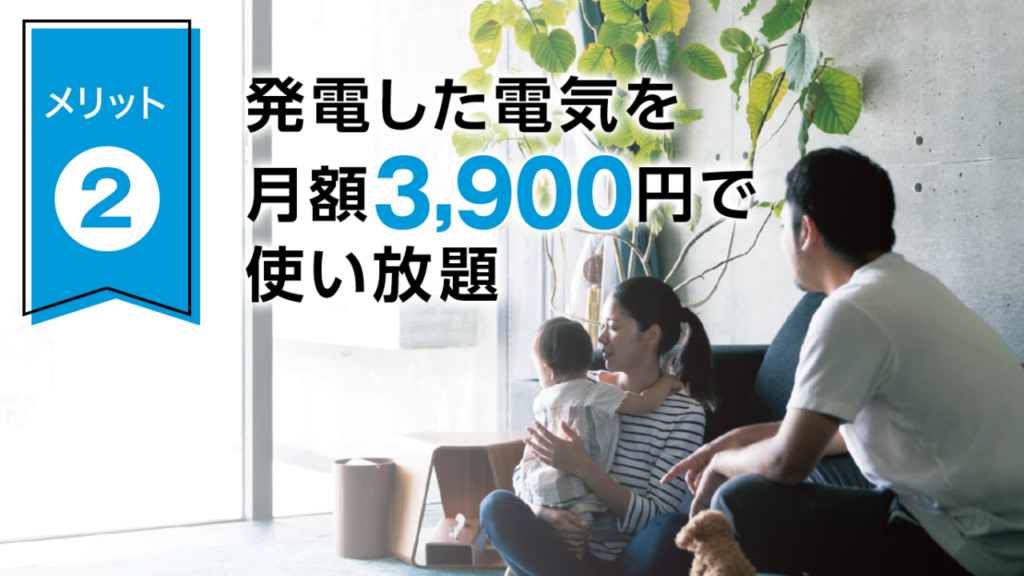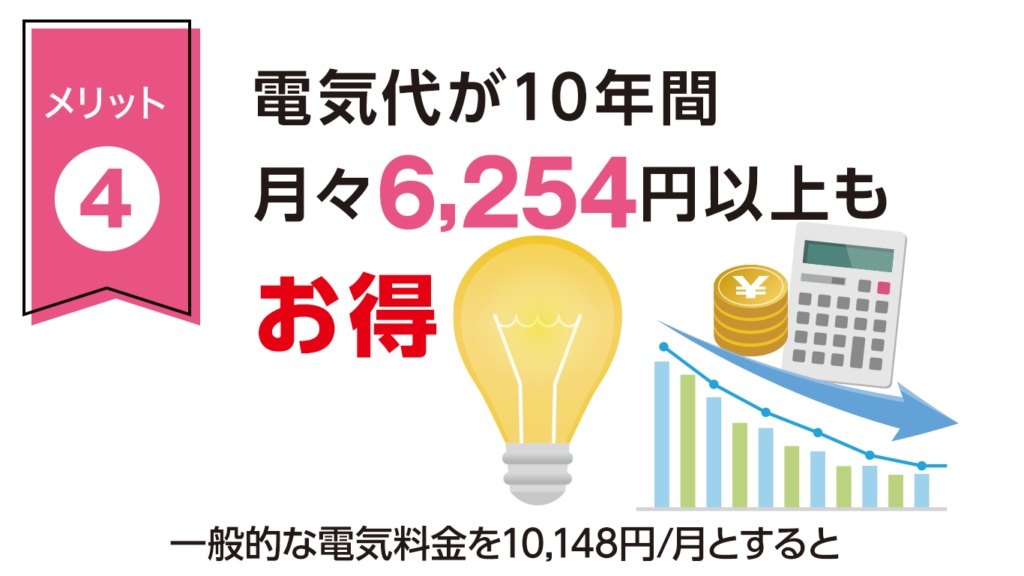 契約から10年間の余剰発電収益を設備設置費用と相殺していく仕組みですが、発電した電気を月3,894円でお使いいただける様にしたことで、お客様の様々なメリットが生まれます。