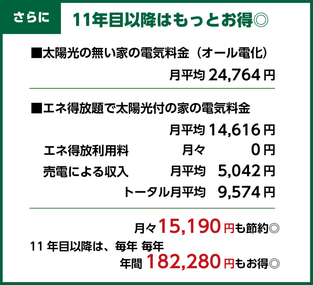 さらに11年目以降には、太陽光システムがお客様に無償譲渡されますので、11年目以降は電力会社から購入する電気代を下げ、更に売電収入を得る事もできます。